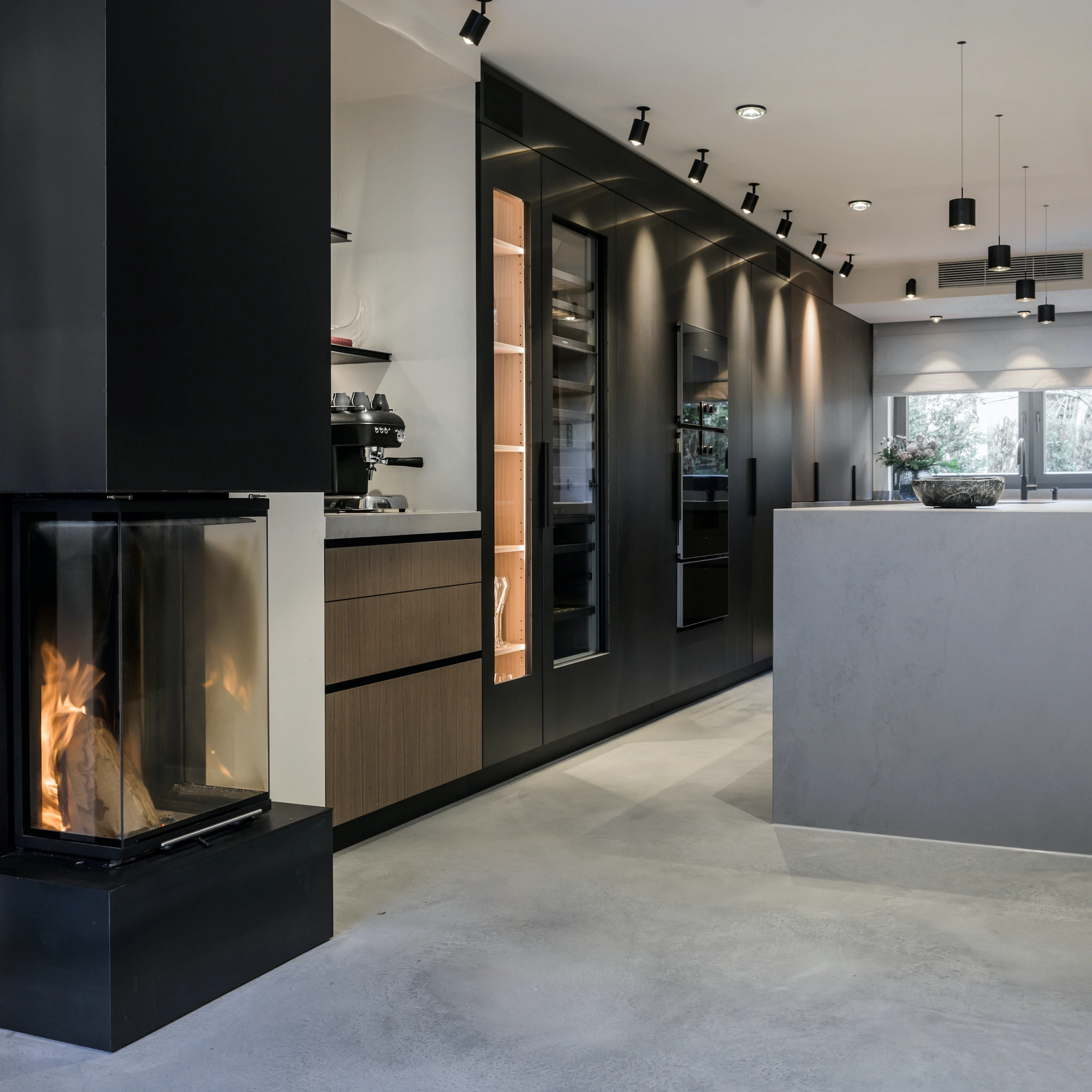 Charmante Eleganz. Eigens hierfür haben wir die Oberfläche von Nussbaumholz so behandelt, dass sie auf Kundenwunsch eine ganz besondere Optik bekommt. Eine gräuliche und edle Anmutung. Das war eine echte Aufgabe und sie ist uns gelungen. Im Wohnbereich die Wände mit Brick. Hinterleuchtete Nischen und schwebende Stahlfächer.